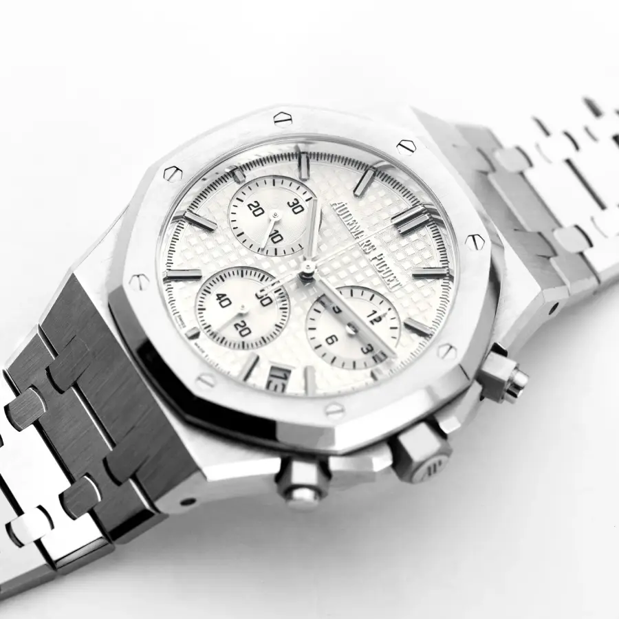 Its elegant “Grande Tapisserie” dial features perfectly balanced chronograph subdials, polished hour markers, luminous accents, and refined hands. The detailed layout enhances readability while maintaining the sporty yet sophisticated character of the Royal Oak chronograph line.
