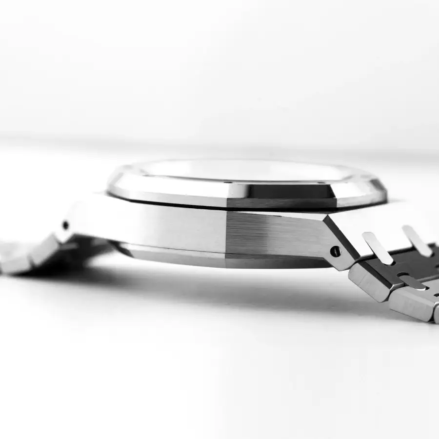 The 41 mm case is crafted from premium 904L stainless steel, showcasing the signature Royal Oak brushed and polished finishing. Paired with the integrated stainless-steel bracelet and AP folding clasp, the watch ensures exceptional comfort, durability, and unmistakable Royal Oak presence. Sapphire crystal protection guarantees long-lasting clarity and scratch resistance.