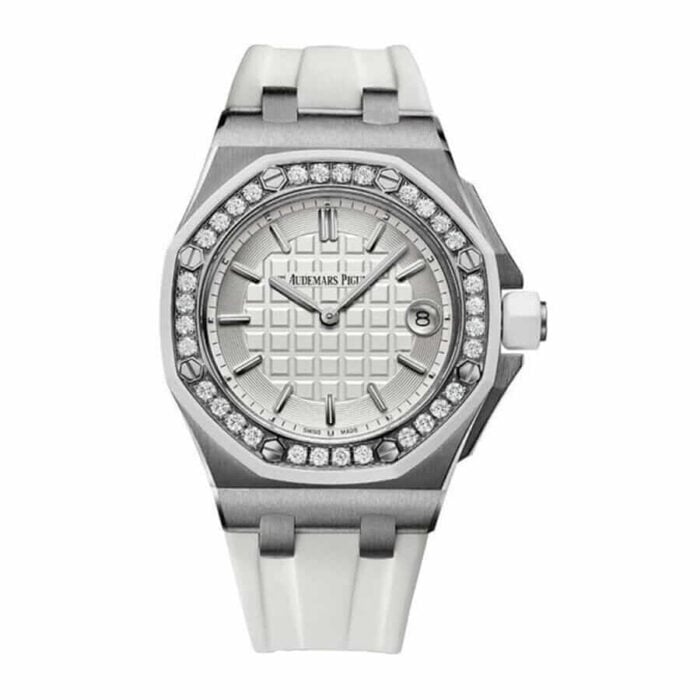 The Audemars Piguet Royal Oak Ladies Silver Replica is a luxury watch. It features a 904L stainless steel case and bezel, both in silver, with a sapphire crystal and adjustable links. The dial is white with stick and dot indices, and ceramic stick hands. The movement is an automatic AP 2714 caliber with a 60-hour power reserve and precision within COSC certification limits. The bracelet is a white rubber with a 904L stainless steel fold clasp.This watch is a 1:1 super clone Swiss mechanism watch, with the same arrangeable serial numbers and cards, font, punto, and finishing for writings and markings, thickness, size, and powerful movement and caliber as the authentic watch. It has passed the 30m water resistance test and is under the protection of a full 2 years International United Luxury warranty. Japanese Mechanism watches may have different materials and movements, so please contact our support team for more information.