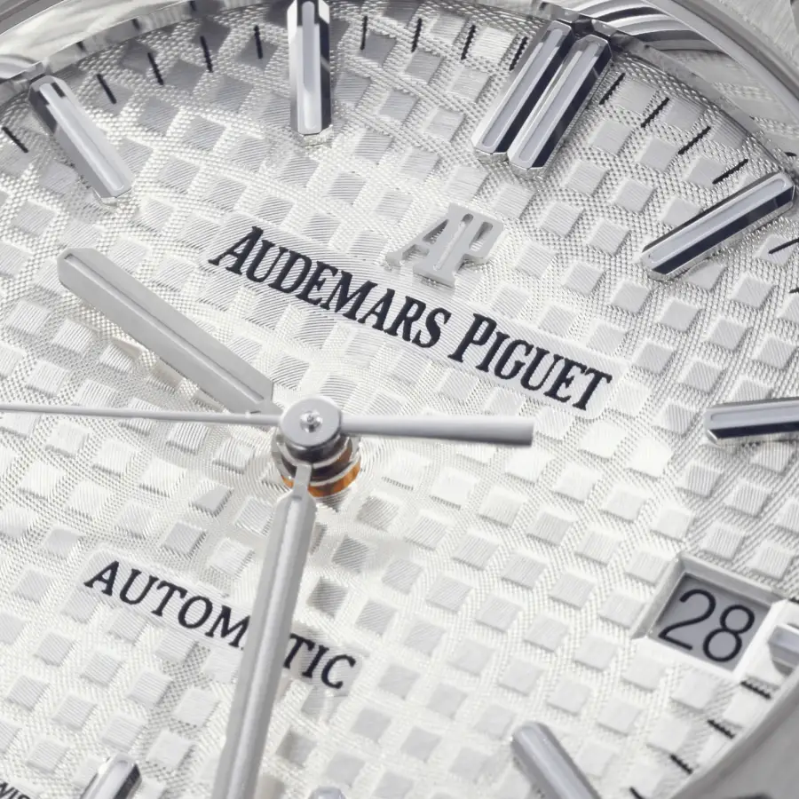 Its elegant “Grande Tapisserie” dial features polished hour markers, luminous accents, and refined hands, creating a perfect harmony between sporty design and timeless sophistication. The clean layout enhances legibility while preserving the iconic Royal Oak identity.