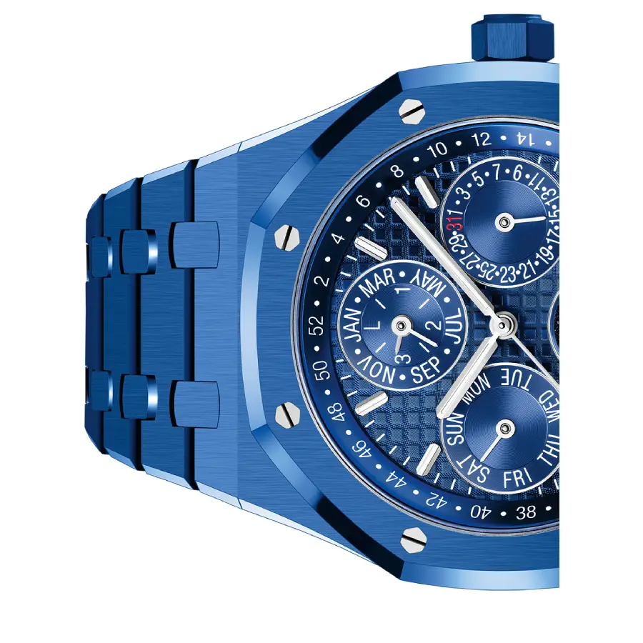 The 41 mm case features a sophisticated blue ceramic-style finish crafted on premium materials, paired with the iconic integrated Royal Oak bracelet for exceptional comfort, durability, and unmistakable AP character. Sapphire crystal on both the front and caseback ensures clarity while showcasing the intricate mechanical structure within.