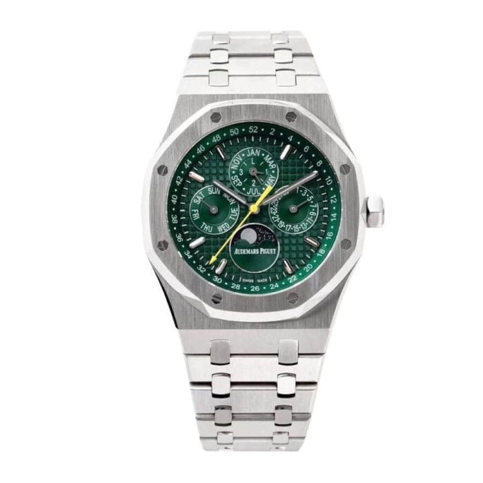 The 41.00 mm case, made from robust 904L stainless steel, showcases a sleek steel color that complements its sporty yet refined design. The matching steel bezel adds a sophisticated touch, further accentuating the watch’s overall appeal. Protected by a sapphire crystal, the vibrant green dial stands out with stick indices and the iconic Royal Oak hour-markers, both crafted from 904L stainless steel. The stick-shaped hands perfectly complement the dial’s aesthetic.