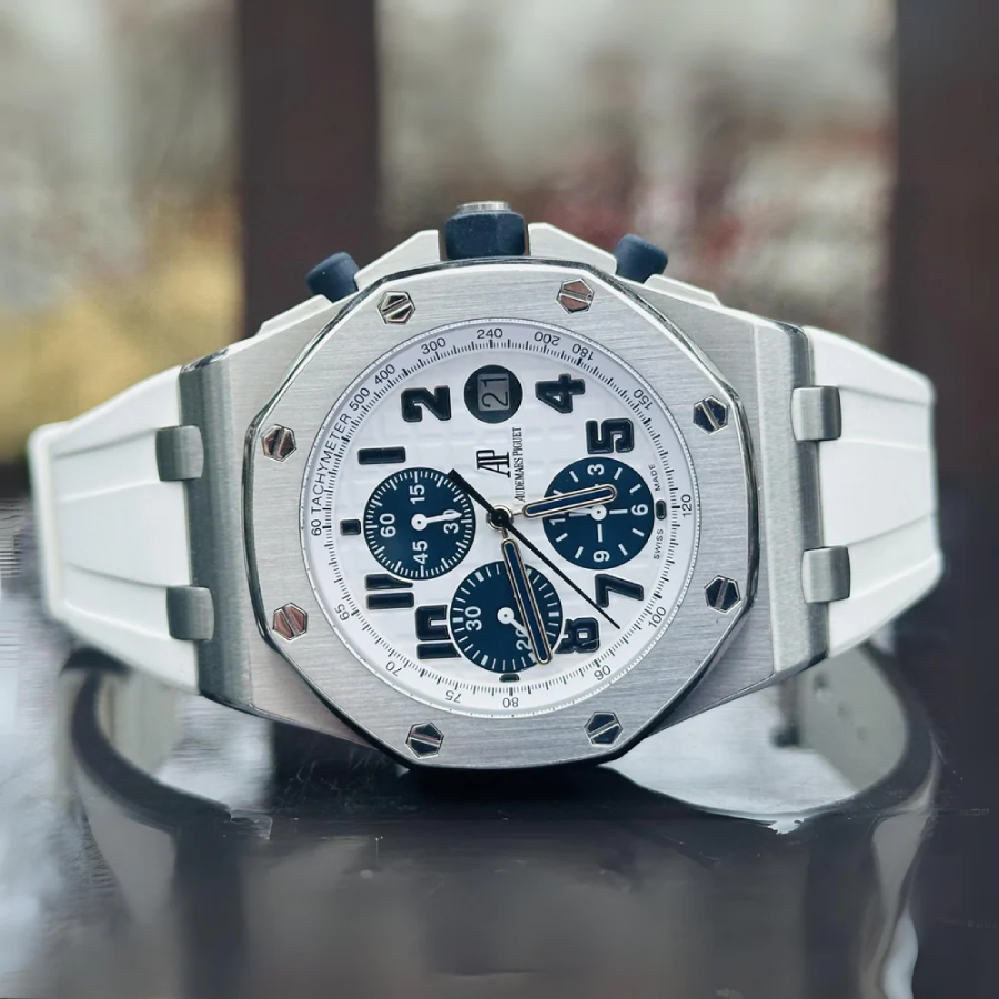 The crisp white color adds a clean and contemporary look, creating a striking contrast that enhances the bold architecture of the Royal Oak case. It’s a perfect choice for those who want a standout yet refined appearance. When paired with a compatible clasp, it ensures reliable fastening and confident use in all conditions.