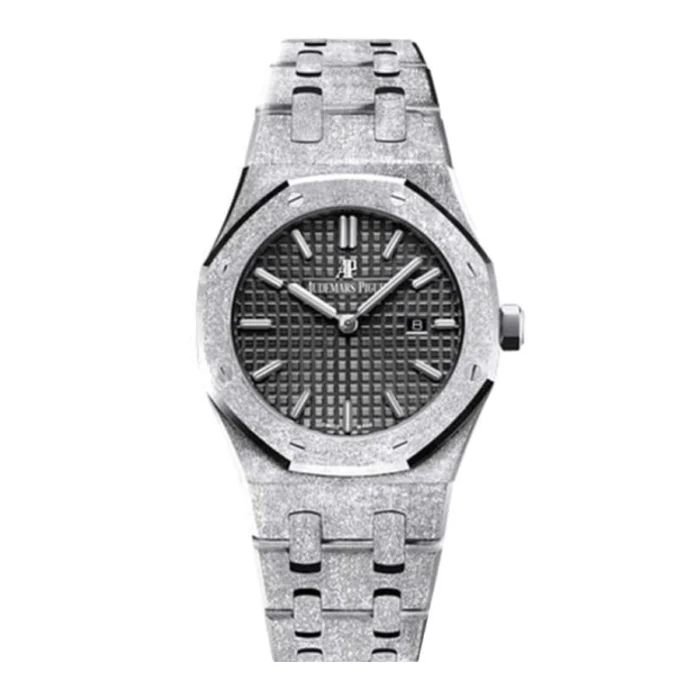 The Frosted AP Replica features a 41mm stainless steel case that exudes strength and durability, making it a reliable companion for any occasion. The stainless steel strap in a sleek silver color adds a touch of sophistication, perfectly complementing the dark grey dial. Designed to withstand the elements, this timepiece is waterproof, ensuring peace of mind even in adverse conditions.