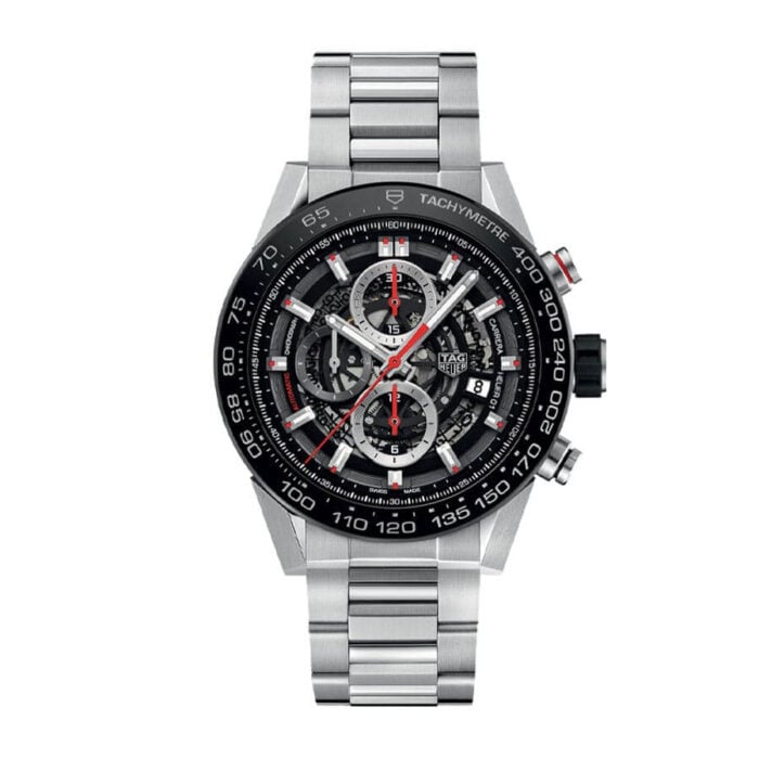 The TAG Heuer Carrera Calibre Heuer 01 Automatic Chronograph CAR2A1W.BA0703 Replica is a striking watch. It features a 904L stainless steel case and bezel, with a black bezel color and a sapphire crystal. The movement is an automatic Calibre Heuer 01 with a 60-hour power reserve and a precision of -3/+3 seconds per day within COSC certification limits. The dial is skeleton with stick indices and stick hands, both made of 904L stainless steel.