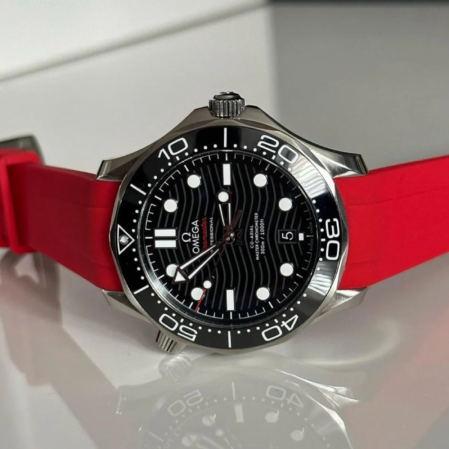 The vibrant red color delivers a striking and energetic look, adding a sporty edge that complements the Seamaster’s bold design. It creates a powerful contrast and enhances wrist presence while maintaining functionality. When paired with a compatible clasp, it ensures reliable fastening and confident performance in all conditions.