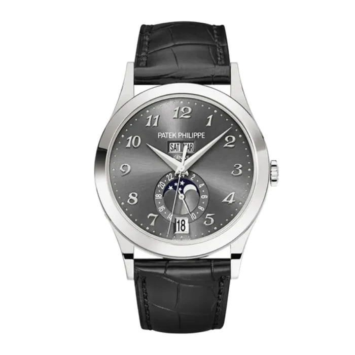 The Patek Philippe 5396G-014 Replica is a striking example of understated luxury and mechanical refinement. Crafted with a 38.5mm 904L stainless steel case finished in elegant white gold, it features a rich opaline white dial with applied white gold Breguet numerals and dauphine hands. The double aperture at 12 o’clock displays the day and month, while a moon phase and date subdial sits at 6 o’clock, offering classic symmetry.