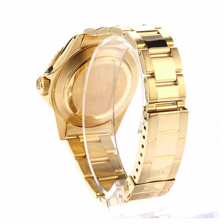 The Rolex GMT-Master II Haribo Gold Replica is a luxurious watch that is sure to impress. It features a 904L stainless steel case and bezel, with a gold color and gem-set bezel. The movement is an automatic Rolex caliber 3186, with a power reserve of 60 hours and precision of -3/+3 seconds per day within COSC certification limits. The dial is black with stick and dot indices, and the hands are 904L stainless steel stick type. The bracelet is also 904L stainless steel with an adjustable oyster type and gold color fold clasp.