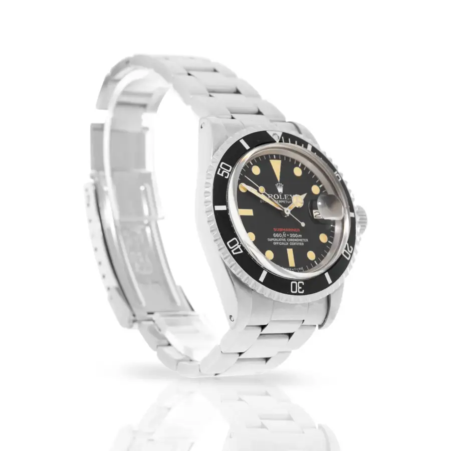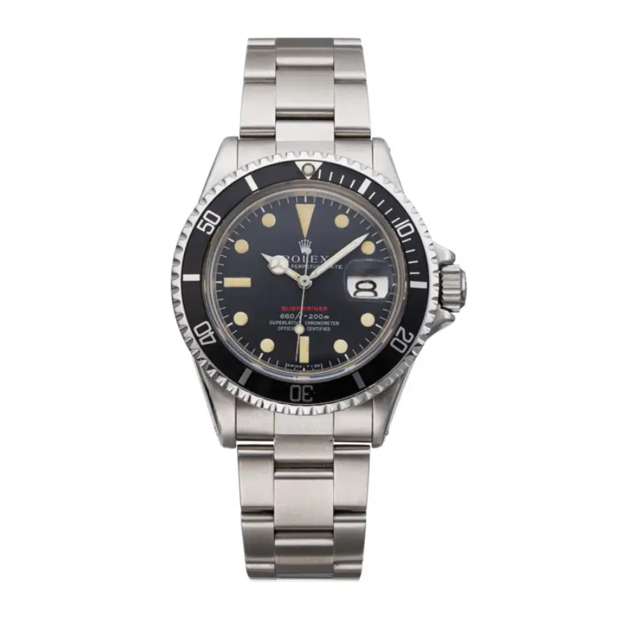 Its matte black dial features luminous hour markers, vintage-style hands, and the iconic red Submariner textโa defining detail that makes the 1680 Red one of the most collectible models in Rolex history. The date window at 3 oโclock with the Cyclops magnifier completes the distinctive design.